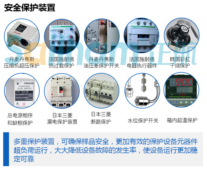 無熔絲開關(guān)、壓縮機(jī)過載保護(hù)、冷媒高低壓保護(hù)、超濕度超溫度保護(hù)、保險(xiǎn)絲、