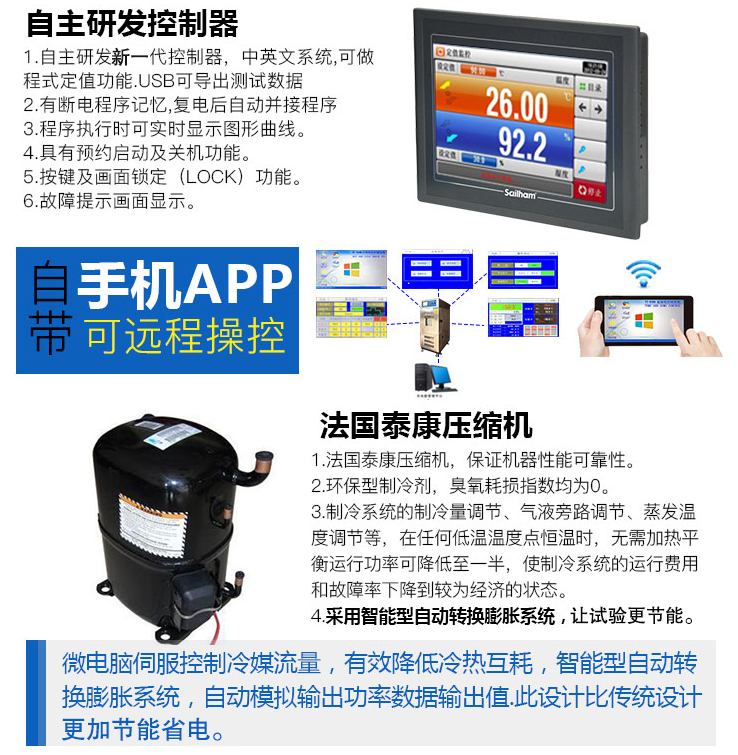 產(chǎn)品型號(hào): ZH-TH-80 支持定制: 支持非標(biāo)定制 壓縮機(jī): 法國(guó)泰康壓縮機(jī) 產(chǎn)品幫助: 查看產(chǎn)品細(xì)節(jié) 或 咨詢?cè)诰€客服 服務(wù)熱線:4008-228-565 程式恒溫恒濕試驗(yàn)箱是航空、汽車、家電、科研等領(lǐng)域必備的測(cè)試設(shè)備,用于測(cè)試和確定電工、電子及其他產(chǎn)品及材料進(jìn)行高溫、低溫、交變濕熱度或恒定試驗(yàn)的溫度環(huán)境變化后的參數(shù)及性能。