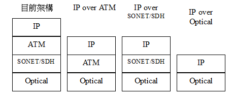以往資料從PC輸出後,依序需經(jīng)由網(wǎng)際網(wǎng)路通訊協(xié)定(IP, Internet Protocol)、非同步傳輸模式(ATM)與同步光纖網(wǎng)路/同步數(shù)位階級(jí)(SONET/SDH)等傳輸格式之後,最後才進(jìn)入光纖中進(jìn)行傳輸;但未來(lái)IP的流量因資料傳輸量增加而大幅成長(zhǎng),加上DWDM技術(shù)的成熟,SONET/SDHATM的存在價(jià)值即倍受質(zhì)疑。
